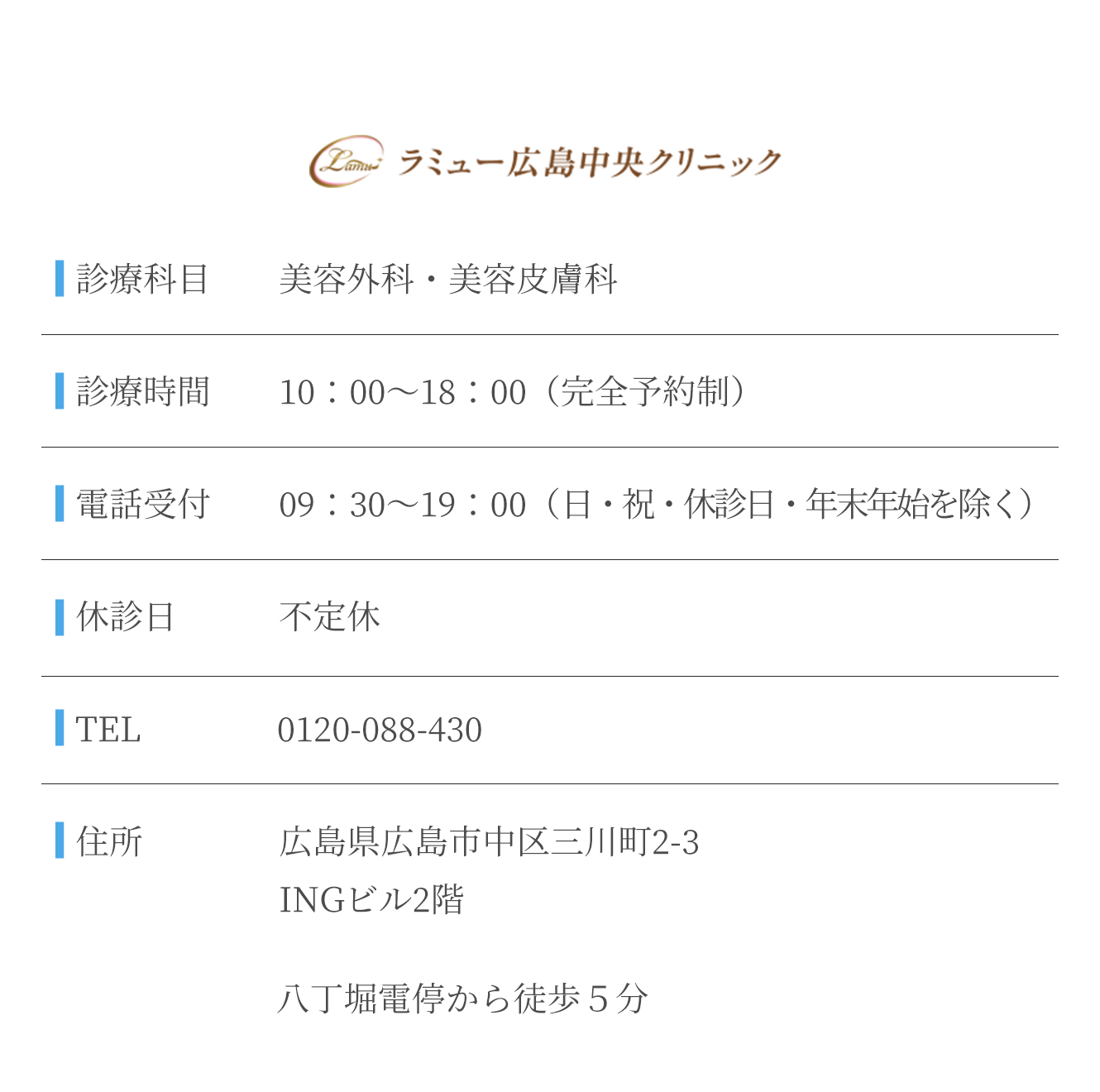 ラミュー広島中央クリニック(以下「当院」といいます。)は個人の人格尊重の理念のもとに、プライバシー情報の保護に最大限の注意を払っております。以下、当ウェブサイトにおいて当院が収集する個人情報に関する、プライバシー保護の考え方を記します。